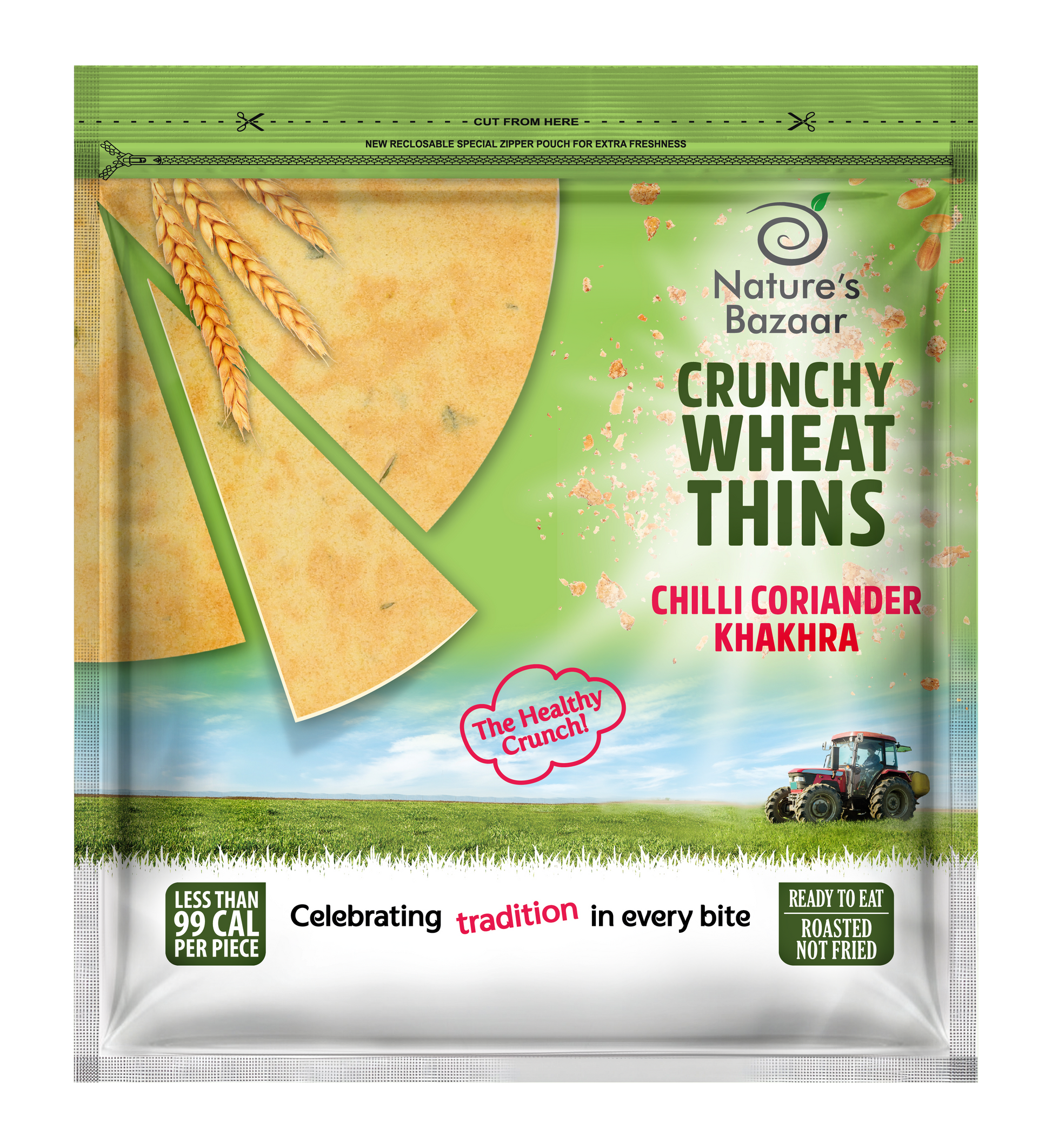 Nature’s Bazaar Chilli Coriander Khakhra is a traditional Gujarati flatbread snack that’s roasted not fried for a delightfully light, crispy texture with fewer than 99 kcal per piece. Blended with fresh coriander leaves, ginger, black pepper, and a touch of chilli, it delivers a zesty, spicy kick balanced with the wholesome crunch of whole wheat flour. Crafted with natural, simple ingredients, this flavour-packed khakhra is perfect on its own or enjoyed with dips, chutneys, or tea—staying true to the Nature’s Bazaar ethos of clean, nourishing snacking.