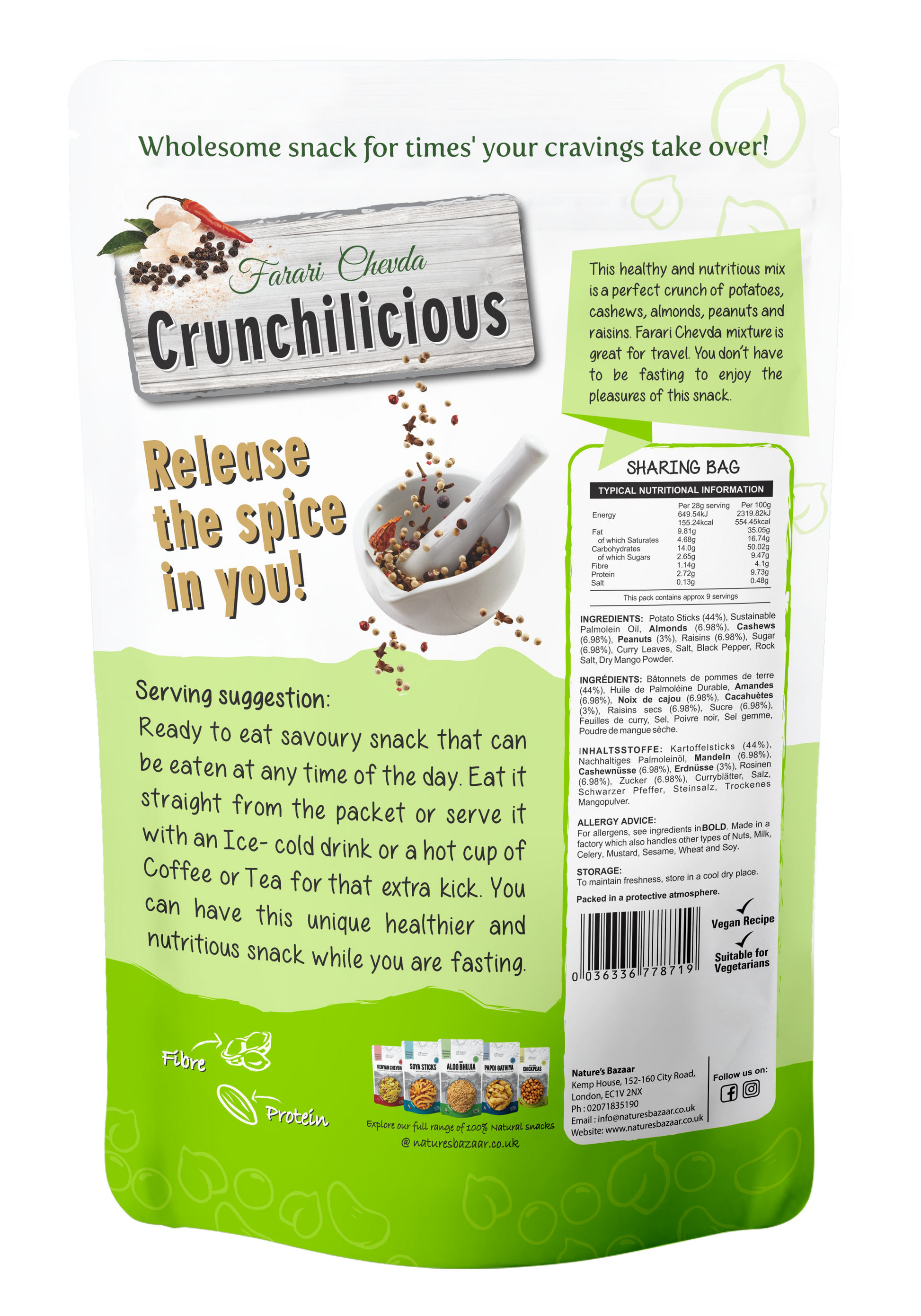 This healthy and nutritious mix is a perfect crunch of potatoes, cashews, almonds, peanuts and raisins. Farari Chevda mixture is great for travel. You don't have to be fasting to enjoy the pleasures of this snack.
