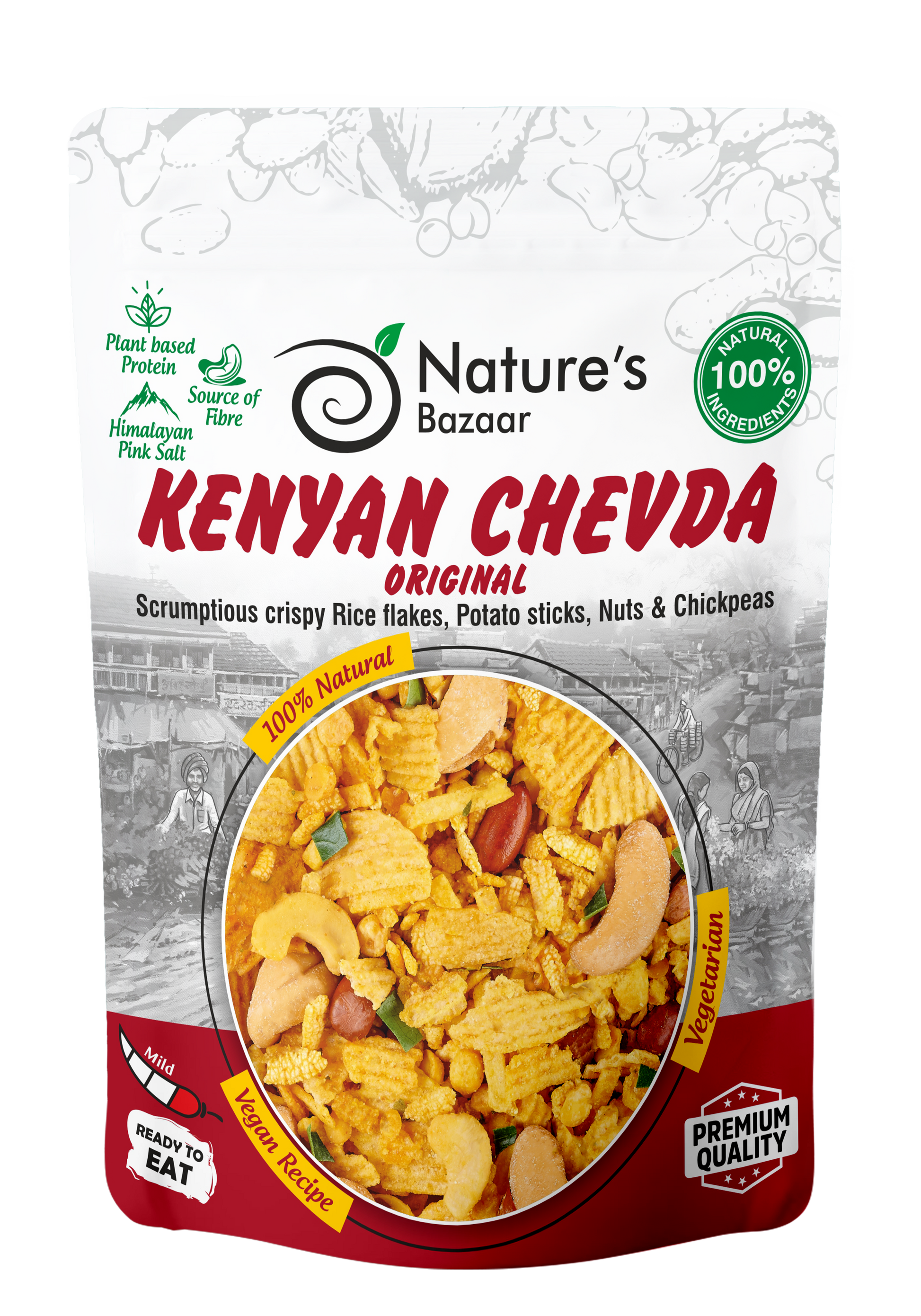 Scrumptious mix of crispy rice flakes, potato sticks, mixed nuts & split chickpeas